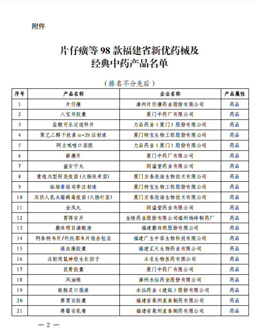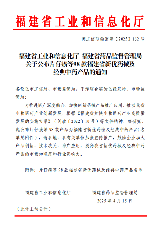 福建省工業(yè)和信息化廳福建省藥品監(jiān)督管理局關(guān)于公布片仔癀等98款福建省新優(yōu)藥械及經(jīng)典中藥產(chǎn)品的通知